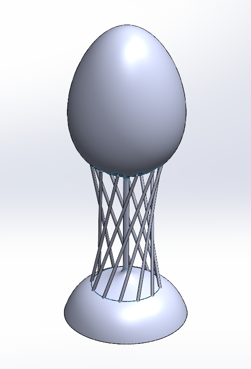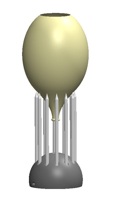 Transitioning now toward design intent, desired outcome, and opinions, as described earlier, the original intent of this work was to demonstrate a direction, a trajectory for my studio practice. I pushed certain things to their limits, such as 3D printing in contour mode. I also wanted to create a piece that involved emotion, and primarily through color. Color played a large role in the surface finishing of this piece, including the emitted light. The yellow was chosen through trial of several colors which consisted of purples, blues, and off-whites. I selected to work with colors that I describe as electric, trying to bring some energy to the work while leveraging the limited color range of LED lights. I also explored different levels of diffusion. The brightness chosen provided for a passivity that I find suitable for a table lamp of this nature. In addition to the yellow, the main body is a complimentary blue. This blue was chosen for precisely that reason. The term juxtaposition comes up often in our discussion and I use the nature of our human attraction of contrast to be carried throughout this work, hence the form of balloon and nails further reinforcing the contrast or juxtaposition seen in this piece.
