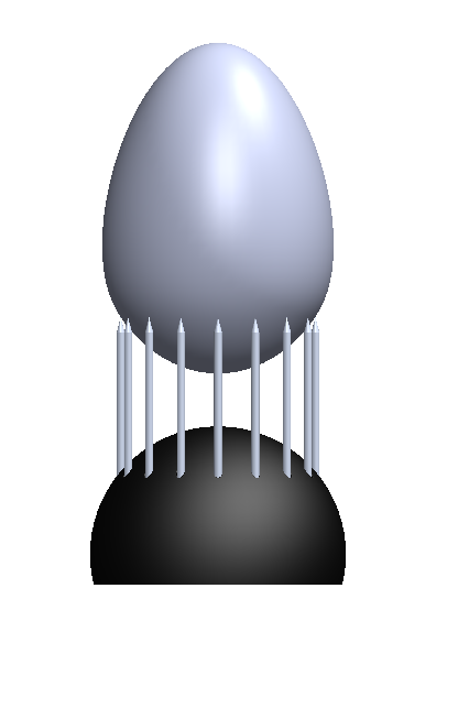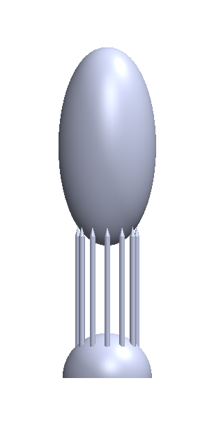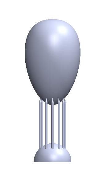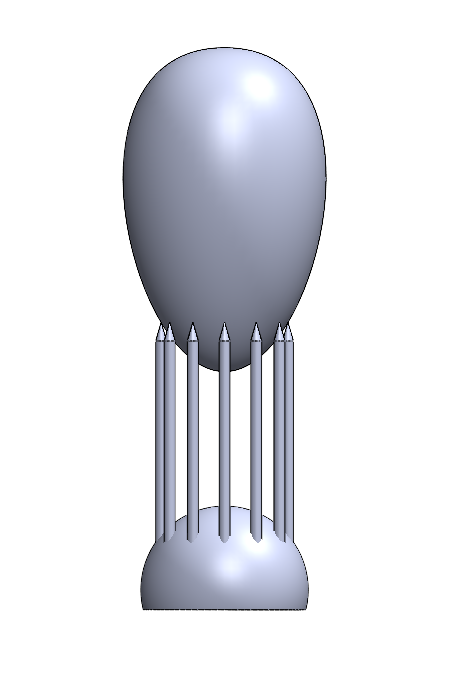 From two meters back, the lamp communicates a unique, elongated proportion divided horizontally in three. The top part is the light source taking on the form of a balloon, the bottom is a base in the shape of a hemisphere and sandwiched between is an array of vertically oriented nails. From this distance, the balloon-shaped bulb seems to be floating, but as I walk closer, I see it’s resting on the tips of the nails with the mouth of the balloon open, allowing electrical wires through. Aesthetically, there is something interesting there and the cabling could be reformatted, braided, or better enclosed for a more industrial designed finish.