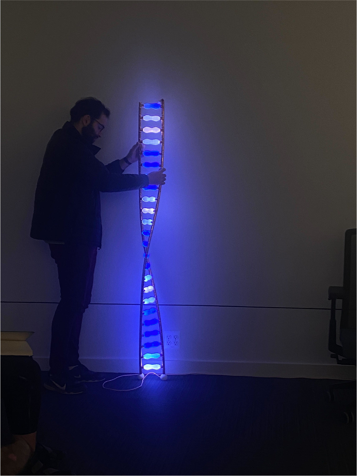 Timelessness is programmed to acclimate to its surroundings by changing rhythm relative to the energy around it, like a tree, planet, human, or even the elements within. To convey a narrative of interconnection, the form semantics and material selection is inspired by the evolution of natural systems and growth. For example, copper has aged with civilization for millennia, DNA symbolizes evolution, and light is the guiding force.